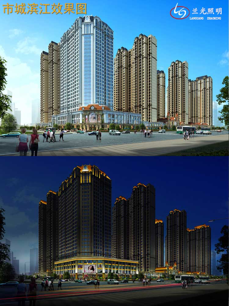 市城濱江樓體亮化設計,改建筑采用的是建筑輪廓照明和局部重點照明,進行建筑環境景觀的在塑造,設計中舍棄景觀中繁瑣細節的表現,將較直觀的景觀以大氣的燈光氛圍,以節能而質樸的燈光為市民營造一個優美高雅的夜間環境。